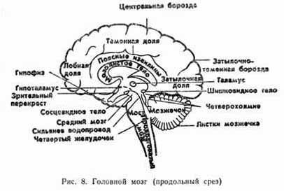 Головной мозг. Спинной мозг непосредственно переходит в стволовую часть головного мозга, расположенную в черепе (рис. 8).
