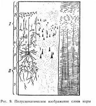 Кора больших полушарий имеет 6—7 слоев, различающихся формой, величиной и расположением нейронов (рис. 9). Между нервными клетками всех слоев коры в процессе их деятельности возникают как постоянные, так и временные связи.