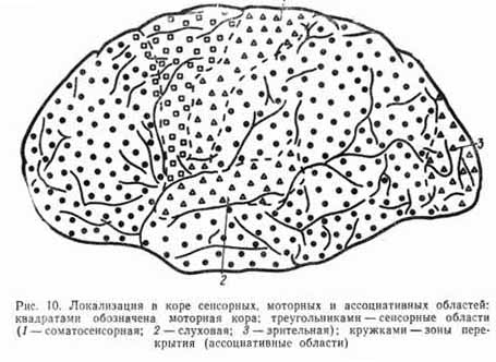 В опытах с удалением различных участков коры, их раздражением и при регистрации электрической активности мозга установлено наличие трех типов корковых областей: сенсорные, моторные и ассоциативные (рис. 10).
