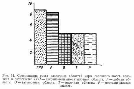 Развитие коры больших полушарий как филогенетически нового образования происходит в течение длительного периода онтогенеза. К моменту рождения ребенка кора больших полушарий имеет такой же тип строения, как у взрослого. Однако поверхность ее после рождения значительно увеличивается за счет формирования мелких борозд и извилин. В течение первых месяцев жизни развитие коры идет очень быстрыми темпами. Большинство нейронов приобретает зрелую форму, происходит миелиниза-ция нервных волокон. Различные корковые зоны созревают неравномерно. Наиболее рано созревает соматосенсорная и двигательная кора,несколько позже зрительная и слуховая. Созревание проекционных (сенсорных и моторных) зон в основном завершается к 3 годам. Значительно позже созревает ассоциативная кора. К 7 годам отмечается значительный скачок в развитии ассоциативных областей (рис. 11).