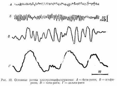 В ЭЭГ взрослого человека выделяют 4 основных типа ритмических электрических колебаний (рис. 12), каждый из которых характерен для определенного функционального состояния.