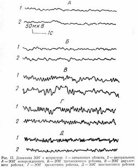 Возрастные особенности электроэнцефалограммы детей и подростков, Анализ электроэнцефалограмм детей различного возраста показывает, что подкорковые структуры, являющиеся наиболее филогенетически древними образованиями мозга и играющие важнейшую роль в обеспечении жизненно важных функций, созревают значительно раньше высших отделов центральной нервной системы (коры больших полушарий). Медленная активность в электроэнцефалограмме, отражающая их функционирование, практически сформирована уже в грудном возрасте и регистрируется уже у новорожденных детей. В результате этого опережающего созревания подкорковых структур ЭЭГ сна детей грудного и раннего детского возраста практически не отличается от взрослого типа. Существенные изменения претерпевает ЭЭГ спокойного бодрствования (рис. 13).