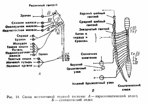 На основании особенностей строения и функциональных отличий в вегетативной нервной системе выделяют два отдела — парасимпатический и симпатический (рис. 14).