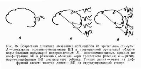 По определению И. М. Сеченова, новорожденный «видит, но видеть не умеет». Восприятие, создание образа предмета связано с функцией ассоциативных областей. По мере их созревания они начинают включаться в анализ поступающей информации. В раннем детском возрасте до 3—4 лет включительно ассоциативные зоны дублируют функцию проекционной коры. Их вызванные ответы по форме, временным параметрам, реактивности соответствуют ответам проекционной зоны (см. рис. 16).
