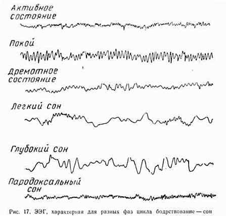 При изучении электрической активности мозга во время сна было замечено, что периодически через каждые 80—90 мин медленные ритмы в электроэнцефалограмме сменяются быстрыми, высокочастотными ритмами, сходными с ритмами бодрствующего мозга. В это время регистрируются быстрые движения глаз, увеличивается частота пульса и дыхания. Это периоды так называемого парадоксального сна. Несмотря на то, что в парадоксальном сне регистрируются такие же ритмы, как при активном бодрствовании, восприятие внешних сигналов резко угнетено. И разбудить человека еще труднее, чем во время медленноволнового сна. Наиболее важной особенностью парадоксального сна является наличие сновидений. Предполагается, что характерные для этой фазы сна «активные» ЭЭГ отражают нейродинамические процессы, связанные со сновидением. Периодическое возникновение во время ночного сна парадоксального сна объясняется функционированием определенной нейрохимической системы. Разрушение так называемого голубого ядра, содержащего большое количество медиатора норадреналина и расположенного в нижней части ретикулярной формации ствола, приводит к выпадению стадии парадоксального сна.