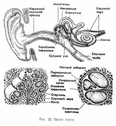 Орган слуха. Слуховые рецепторы находятся в улитке внутреннего уха, которая расположена в пирамиде височной кости. Звуковые колебания передаются к ним через целую систему вспомогательных образований, обеспечивающих совершенное восприятие звуковых раздражений. Орган слуха человека состоит из трех частей — наружного, среднего и внутреннего уха (рис. 22).