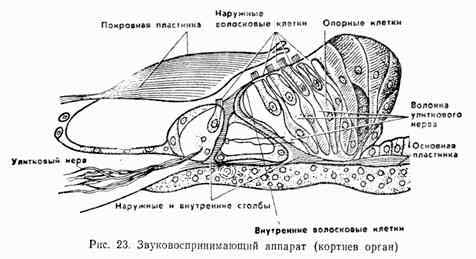 Внутри среднего канала улитки, в улитковом ходе, находится звуковоспринимающий аппарат — спиральный, или кортиев, орган (рис. 23). Кортиев орган имеет базилярную (основную) пластинку, которая состоит примерно из 24 тыс. тонких фиброзных волоконец различной длины, очень упругих и слабо связанных друг с другом. Вдоль основной пластинки в 5 рядов располагаются опорные и волосковые чувствительные клетки, которые являются собственно слуховыми рецепторами.