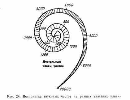 Воздушные звуковые волны, попадая в наружный слуховой проход, вызывают колебания барабанной перепонки. Далее колебания барабанной перепонки передаются через среднее ухо. Система слуховых косточек, действуя как рычаг, усиливает звуковые колебания и передает их жидкости, находящейся между костным и перепончатым лабиринтами улитки. При распространении звуковых волн в улитке смещается основная мембрана, и ее колебания вызывают перемещение ресничек волосковых клеток. В результате этого возникает рецепторный потенциал, возбуждающий окончания нервных волокон. Колебания основной мембраны зависят от высоты звука. Эластичность ее на разных отрезках не одинакова (рис. 24). Ближе к овальному окну мембрана уже и жестче, дальше — шире и эластичнее. Поэтому ее более узкие участки восприимчивы к высоким частотам, более широкие — к низким. От высоты звука зависит, какой участок мембраны ответит на этот звук колебанием наибольшей амплитуды. Соответственно на звуки разной частоты реагируют разные волосковые клетки. Клетки, реагирующие на высокие тоны, расположены на узкой, туго натянутой части основной мембраны, вблизи овального окна; рецепторы низких звуков — на широких, менее туго натянутых отрезках мембраны. Это проверено в опытах на собаках. Если у собак разрушить улитку в области основания, то исчезают условные рефлексы на высокие тоны, если разрушить верхушку улитки — исчезают условные рефлексы на низкие тоны. Разрушение средней части улитки приводит к выпадению рефлексов на средние тоны. Следовательно, анализ различения звука происходит уже на уровне рецепторов. Сила звука, измеряемая в децибелах, кодируется числом возбужденных нейронов и частотой их импульсации. Пороги возбуждения внутренних и наружных рецепторных клеток не одинаковы. Возбуждение внутренних волосковых клеток возникает при большой интенсивности звука, наружных— при меньшей. В зависимости от интенсивности звука меняется соотношение возбуждения внутренних и наружных волосковых клеток. Возникшее возбуждение по нервным волокнам через систему переключательных ядер передается в слуховую кору, где соотносятся частота и сила звуковых стимулов и осуществляется распознавание сложных звуков. Смысл услышанного интерпретируется в ассоциативных корковых зонах.