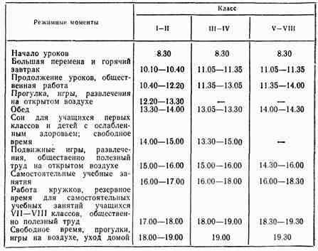 Группы продленного дня обеспечиваются помещением, отвечающим гигиеническим требованиям, необходимой мебелью, пособиями для внеклассной работы (книги, настольные игры и т. д.). Школы с продленным днем, так же как и школы-интернаты, одновременно с высоким уровнем общественного воспитания призваны содействовать хорошему физическому развитию и укреплению здоровья детей. Поэтому в таких школах особенно необходимо широко проводить оздоровительные мероприятия в отношении всех учащихся и особенно в отношении детей с ослабленным здоровьем. Режим дня организуется таким образом, что общешкольные помещения (столовая, актовый и гимнастический залы, веранды, кабинеты и лаборатории), а также пришкольный участок используются поочередно разными классами. Это ни в какой мере не нарушает гигиенических требований, поскольку возрастные особенности детей, в частности особенности высшей нервной деятельности, диктуют именно дифференцированное построение режима дня в I, II—III, IV и V—VIIIклассах. Исходными для такого построения являются нормативы продолжительности учебных и неучебных занятий и отдыха учащихся младших и средних классов.