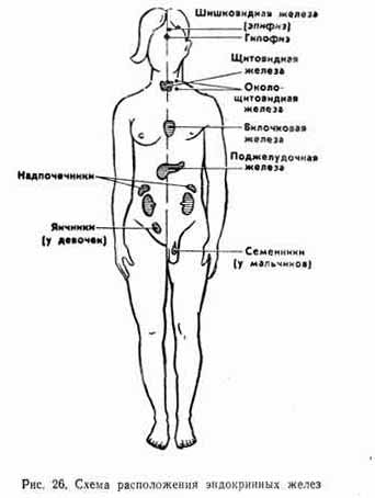 Железы внутренней секреции. В регуляции функций организма важная роль принадлежит эндокринной системе. Органы этой системы— железы внутренней секреции — выделяют особые вещества, оказывающие существенное и специализированное влияние на обмен веществ, структуру и функцию органов и тканей. Железы внутренней секреции отличаются от других желез, имеющих выводные протоки (желез внешней секреции), тем, что выделяют продуцируемые ими вещества прямо в кровь. Поэтому их называют эндокринными железами (греч. endon — внутри, krinein — выделять) (рис. 26).