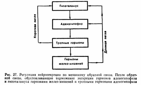 Регуляция нейросекреции по механизму обратной связи. Гипоталамо-гипофизарной системе принадлежит важнейшая роль в поддержании необходимого уровня гормонов. Это постоянство осуществляется благодаря обратным влияниям гормонов желез внутренней секреции на гипофиз и гипоталамус. Циркулирующие в крови гормоны, влияя на гипофиз, тормозят выделение в нем тропных гормонов либо, воздействуя на гипоталамус, снижают высвобождение рилизинг-факторов. Это так называемая отрицательная обратная связь (рис. 27).