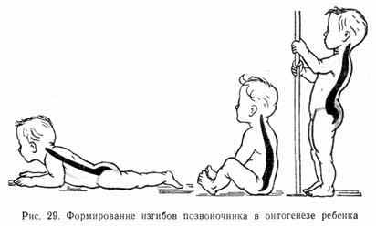 Структура тканей позвоночного столба существенно изменяется с возрастом. Окостенение, начинающееся еще во внутриутробном периоде, продолжается в течение всего детского возраста. До 14 лет окостеневают только средние части позвонков. В период полового созревания появляются новые точки окостенения в виде пластинок, которые сливаются с телом позвонка после 20 лет. Процесс окостенения отдельных позвонков завершается с окончанием ростовых процессов — к 21—23 годам. Позднее окостенение позвоночника обусловливает его подвижность и гибкость в детском возрасте. Кривизна позвоночника, являющаяся его характерной особенностью, формируется в процессе индивидуального развития ребенка. В самом раннем возрасте, когда ребенок начинает держать головку, появляется шейный изгиб, направленный выпуклостью вперед (лордоз). К 6 месяцам, когда ребенок начинает сидеть, образуется грудной изгиб с выпуклостью назад (кифоз). Когда ребенок начинает стоять и ходить, образуется поясничный лордоз (рис. 29). С образованием поясничного лордоза центр тяжести перемещается кзади, препятствуя падению тела при вертикальном положении.