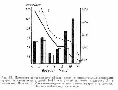 В дошкольном и младшем школьном возрастах отмечается четкое соответствие интенсивности снижения основного обмена и динамики ростовых процессов: чем больше скорость относительного роста, тем значительнее изменения обмена покоя (рис. 35).