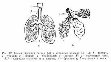 Бронхиолы разветвляются на альвеолярные ходы с мешочками, стенки которых образованы множеством легочных пузырьков — альвеол. Альвеолы являются конечной частью дыхательного пути (рис. 42). Стенки легочных пузырьков состоят из одного слоя плоских эпителиальных клеток. Каждая альвеола окружена снаружи густой сетью капилляров. Через стенки альвеол и капилляров происходит обмен газами — из воздуха в кровь переходит кислород, а из крови в альвеолы поступают углекислый газ и пары воды.