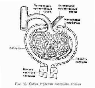 Почки получают крови больше, чем любой другой орган, в них происходит образование мочи из веществ, приносимых кровью. Структурно-функциональной единицей почки является тельце почки— нефрон (рис. 43), в каждой почке около 1 млн. нефронов. Нефрон состоит из двух основных частей: кровеносных сосудов и почечного канальца.