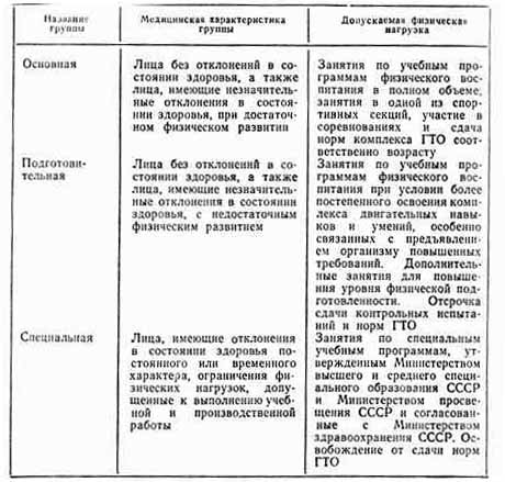 Примечание. В отдельных случаях при выраженных нарушениях функций опорно-двигательного и нервно-мышечного аппарата и значительных нарушениях здоровья, лрепятствующих групповым занятиям в условиях учебного заведения, учащихся направляют на занятия лечебной физкультурой в лечебно-профилактические учреждения. Перевод из одной медицинской группы в другую производится после дополнительного обследования.
