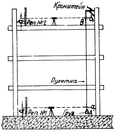 Передачу отметок на вышележащие этажи производит с помощью двух нивелиров, реек и подвешенной стальной рулетки. Рейки устанавливают на реперы, расположенные на исходном и данном монтажных горизонтах (рис. 34). Отсчеты по рулетке берутся одновременно по двум нивелирам. Для большей устойчивости рулетки к ней снизу подвешивают груз, помещаемый в сосуд с вязкой жидкостью. В результате наблюдений получают отсчеты