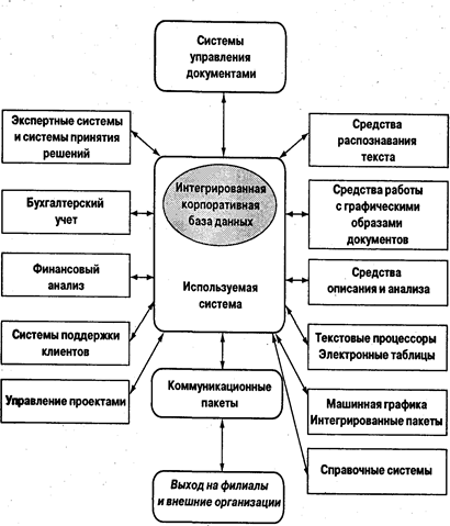 • коммуникационные сети, связывающие оргтехнические блоки между собой и с центральными процессорами, а также с внешними источниками информации;
