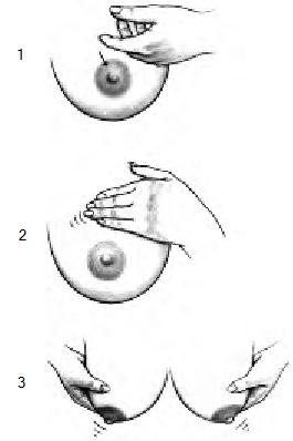 2. Используя движение, похожее на то, когда вы проверяете грудь, массируйте молочные железы и протоки, плотно надавливая в сторону грудной клетки на грудь пальцами, сложенными вместе. Движения начинайте сверху, продвигаясь вниз по спирали к околососковому кружку. Сделайте несколько круговых поглаживающих движений, прежде чем перейти к следующему месту.