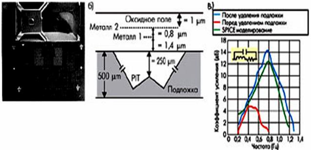 Рис. СВЧ CMOS-усилитель с подвешенной MEMS-катушкой индуктивности (а), поперечное сечение катушки индуктивности (в) и её характеристики усилителей с удалённым и неудалённым материалом подложки под катушкой индуктивности. (с).