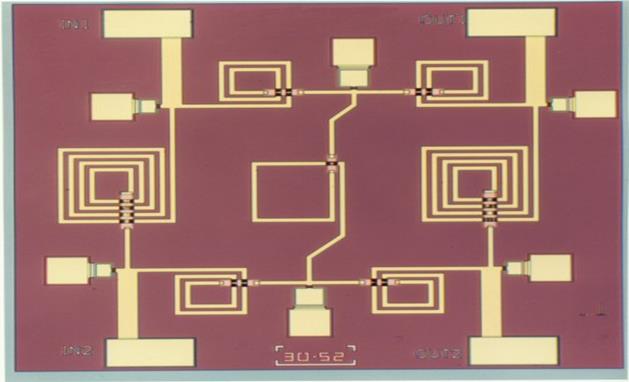 Рис. Шлейфный направленный ответвитель со сдвигом фаз между выходами 2 и 3 - 90° для частоты 2.1.ГГц на пленочных LC - элементах в виде монолитной интегральной схемы. (Темно зеленым представлены пленочные конденсаторы, светло зеленым – заземленные отверстия.)