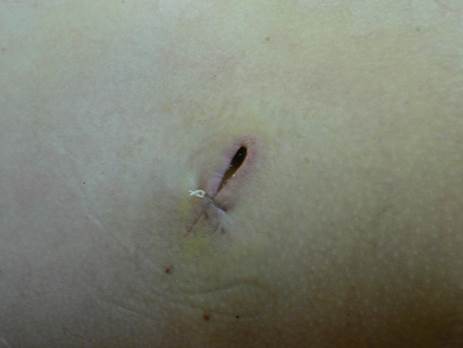 Заключение: Ушитая послеоперационная рана левой дорзо-люмбальной области (контрапертура после удаленного дренажа из брюшной полости) без признаков воспаления.