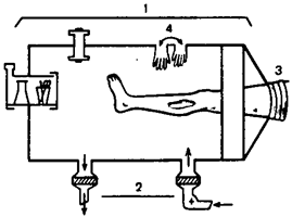 | 1- камера из прозрачной поливинилхлоридной пленки; 2- система стерильного воздухообмена; 3- система крепления изолятора к телу больного; 4- перчатки для манипуляций. |