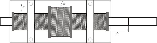. Середины соленоидов совпадают, совпадают и оси соленоидов. Вдоль оси соленоидов может перемещаться шток.