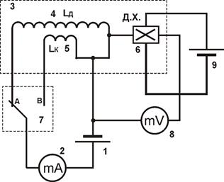 Питание соленоидов осуществляется от регулируемого источника постоянного напряжения «0…+15 В» 1. Ток в соленоидах измеряется миллиамперметром 2. Переключатель 7 позволяет подключать к источнику напряжения 1 либо длинный соленоид 4 (положение переключателя А) либо короткий 5 (положение переключателя В).