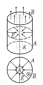 направлено вдоль оси катода. Таким образом, магнитное и электрическое поля взаимно перпендикулярны. Напряженность поля E максимальна у катода. В случае, если катод имеет форму тонкой нити, величина E, пропорциональная 1 / r, быстро уменьшается с ростом расстояния r от катода. Поэтому изменение скорости электронов до значения, равного v, происходит, в основном, вблизи катода, а при дальнейшем движении можно считать скорость практически постоянной.