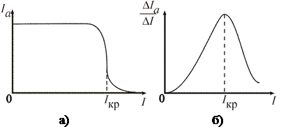 Для определения критического тока I кр используют экспериментальную зависимость анодного тока от тока в соленоиде: I а = f (I) (рисунок 4а), которая по виду подобна зависимости I а = f (B): при критическом токе в соленоиде наблюдается резкое снижение анодного тока I а.