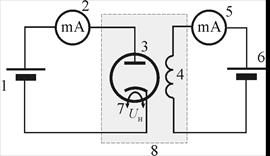 Рисунок 5. Электрическая схема: 1 – источник постоянного напряжения «+15 В»; 2 – мультиметр для измерения анодного тока (режим A