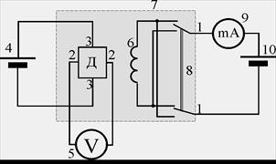 Датчик помещен в зазор сердечника электромагнита 6 и подсоединен к источнику постоянного напряжения 4. Обмотка электромагнита подключена к регулируемому источнику постоянного напряжения 10 через переключатель 8. С помощью переключателя можно изменять направление тока I эм в обмотке электромагнита. Ток I эм измеряют миллиамперметром 9. Для измерения напряжения Холла предназначен цифровой вольтметр 5.