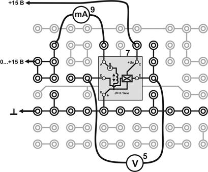 2 V, входы COM, VW); (3–3) – цепь питания датчика Холла Д; 4 –источник стабилизированного постоянного напряжения «+15 В»; 7 – миниблок «Эффект Холла»; 10 –регулируемый источник постоянного напряжения «0…+15 В»
