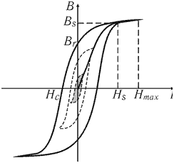 имеет вид петли гистерезиса (рисунок 1). Площадь петли определяется амплитудой напряженности магнитного поля H max. Площадь будет наибольшей, когда H max = H s, где Hs – напряженность поля, при которой образец намагничивается до насыщения. Эта предельная петля на рисунке 1 показана сплошной линией. При меньшей амплитуде (H max < Hs) получаются петли гистерезиса с меньшей площадью. Такие частные циклы показаны пунктирной линией. Увеличение напряженности больше Hs (участок от Hs до H max) приводит к линейной зависимости индукции B от H.
