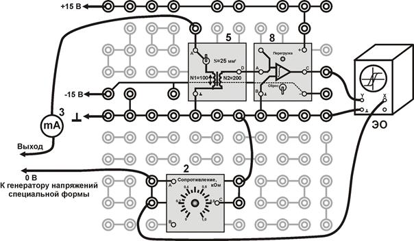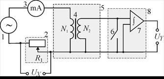 20 mA, входы COM, mA); 4 – тороид с первичной N 1 и вторичной N 2 обмотками; 5 – миниблок «Фер-ромагнетик»; 6 – демпферный ключ; 7 – интегратор тока; 8 – миниблок «Интегратор тока»; UХ – напряжение, подаваемое на вход X осциллографа, UX = UR ~ I ~ H; UY – напряжение, подаваемое на вход Y осциллографа, UY = Uинт ~ Q ~ B