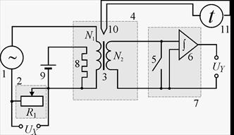 1 – генератор сигналов специальной формы; 2 – миниблок «Реостат» с сопротивлением R 1; 3 – тороид с первичной N 1 и вторичной N 2 обмотками; 4 – миниблок «Точка Кюри»; 5 – демпферный ключ; 6 – интегратор; 7 – миниблок «Интегратор тока» (положение тумблера «Сброс»); 8 – электронагреватель; 9 –регулируемый источник постоянного напряжения «0…+15В»; 10 – термопара; 11 – мультиметр (режим °С, входы 5 (см. рис. 3 на стр. 9)); UX – напряжение на входе X осциллографа,