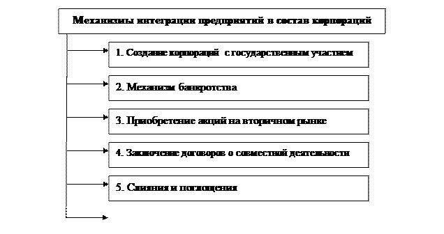 К основным механизмам интеграции предприятий в состав корпораций авторы традиционно относят механизм приватизации, механизм банкротства, приобретение акций на вторичном рынке, заключение договоров о совместной деятельности, создание корпораций с государственным участием, слияние и поглощение, разукрупнение (рисунок 3).