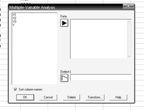 Введём в поле Data переменные х1, х2, х3, у, для чего выделим указанные переменные нажатием левой кнопки мыши, затем кнопки Data и ОК.