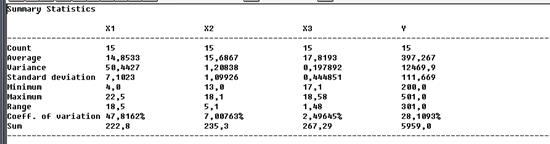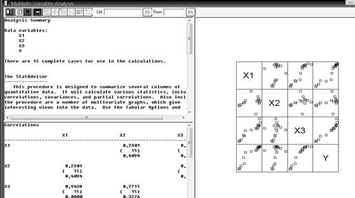 По умолчанию на экране появится окно Multiple – Variable Analysis(рисунок 5), в котором представлена информация о том, что к анализу приняты переменные х1, х2, х3,у,матрица парных коэффициентов корреляции и ее графическое изображение.