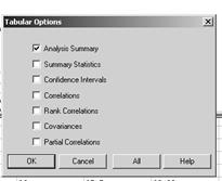 Нажмите кнопку табличных опций (вторая слева), на экране появится окно (рисунок 6), в котором рассматриваются следующие опции: описательный анализ, описательные статистики, доверительные интервалы, корреляции, ранговые корреляции, ковариации, частные корреляции.