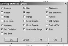 В окне Summary Statistics Options (рисунок 8) пометьте следующие статистики: average, variance, std. deviation, range, coeff. of var, sum. На экране появится отчет (рисунок 9) о значениях оценок заказанных статистик.