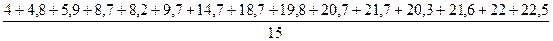 ((4 - 14,853)2+(4,8 - 14,853)2+(5,9 - 14,853)2+(8,7 - 14,853)2 +(8,2 - 14,853)2 + (9,7 - 14,853)2 + (14,7 - 14,853)2 + (18,7 - 14,853)2 + (19,8 - 14,853)2 + (20,7 - 14,853)2 + (21,7 - 14,853)2 + (20,3 - 14,853)2 + (21,6 - 14,853)2 + (22 - 14,853)2 + (22,5 - 14,853)2) = =50,4427