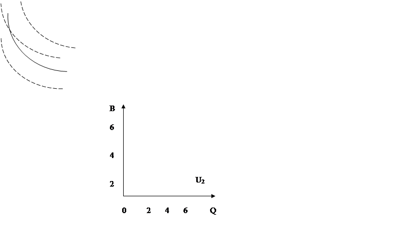 Эта кривая проведена таким образом, что если бы потребитель мог выбрать любую точку на ней, они были бы для него одинаковы, желательны, и ему было бы совершенно всё равно, какую комбинацию он получит. Кривая U2 - это одна из бесчисленного множества возможных кривых. Если возьмём более высокий уровень удовлетворения потребности, то кривая примет иной вид.