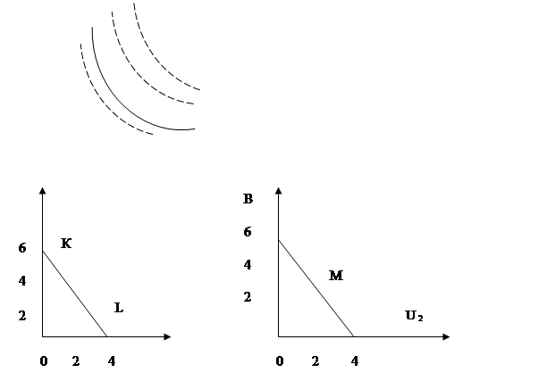 В точке M линия возможностей потребления KL касается кривой безразличия U2. Это и есть наивысшая кривая которой он может достичь. В положении равновесия цена товара пропорциональна его предельной полезности.