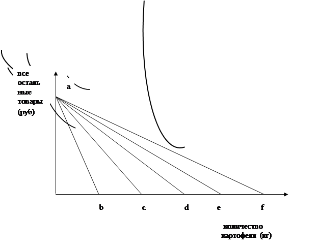 Когда цена на картофель уменьшается, а цены на остальные товары остаются неизменными, то угол наклона бюджетной линии уменьшается (прямые ab, ac, ad).