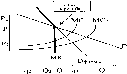 Таким образом, и при понижении, и при повышении цен кривая спроса на продукцию фирмы в условиях нескоординированной олигополии имеет ломаный вид. До момента начала активной реакции конкурентов она следует по одной траектории, а после него — по другой.