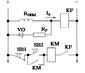 Эта защита осуществляется с помощью минимального токового реле KF, катушка которого включается в цепь обмотки возбуждения двигателя, как это показано на рисунке 1. При этом замыкающий контакт реле KF помещается в цепь катушки контактора КМ, что позволяет включать двигатель только при наличии тока возбуждения в его обмотке возбуждения ОВМ. При работе ЭП в случае исчезновения или резкого снижения тока возбуждения контакт реле KF разомкнется и контактор КМ, потеряв питание, отключит двигатель от сети.