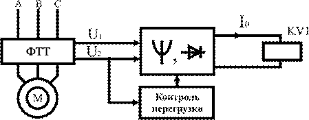 При нормальной работе электродвигателя в катушке реле КVтечет небольшой ток, меньше тока отпускания реле. Если электродвигатель не запускается или затормаживается во время работы, то токи нагрузки электродвигателя, следовательно, и измеряемые напряжения U1 и U2резко увеличиваются. Ток в катушке реле KVтакже резко возрастает и становится больше тока притягивания реле, что приведет к срабатыванию реле и отключению электродвигателя.