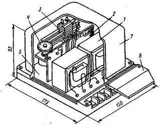 Рисунок 5 - Модернизированное фазочувствительное устройство защиты ФУЗ-М: 1 — трансформатор тока; 2 — печатная плата; 3 - реле защиты; 4 — шкала потенциометра; 5 — изоляционное основание; 6 — крышка, закрывающая клеммную колодку; 7 — крышка
